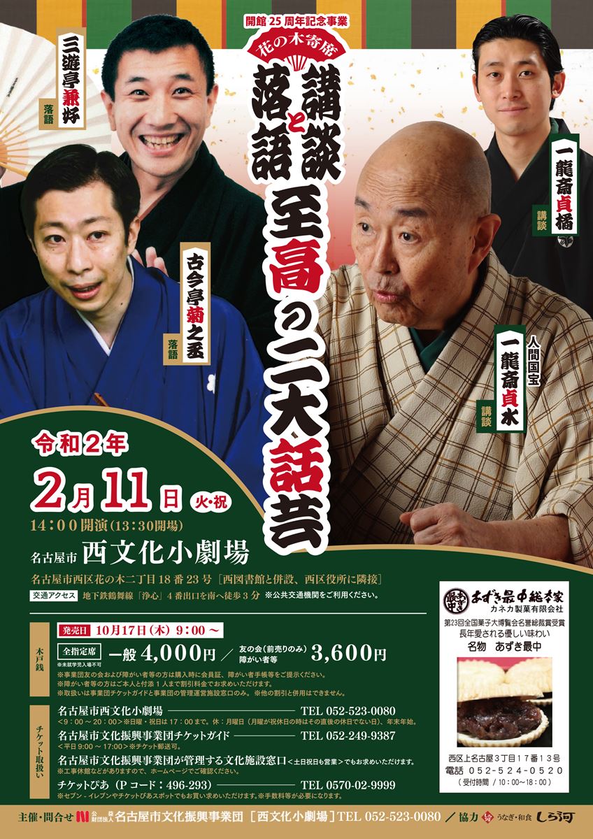 兼好・菊之丞・貞水 講談と落語 至高の二大話芸 20/2/11(火) 名古屋市西文化小劇場 シェア ツイート 上演情報 ジャンル 落語/演芸 料金 【全席指定】4,000円 ※未就学児童は入場不可。 表示できるチケット情報はありません詳しくはこちら キャスト&スタッフ 出演 古今亭菊之丞 三遊亭兼好 一龍斎貞水 一龍齋貞橘 お問い合わせ 名古屋市西文化小劇場 シェア ツイート