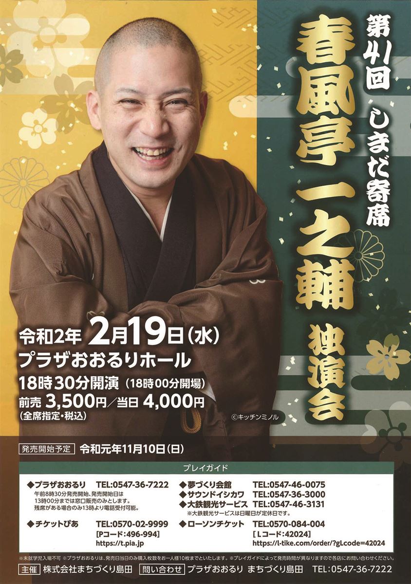 春風亭一之輔独演会 第41回 しまだ寄席 20/2/19(水) 島田市民総合施設プラザおおるり ホール シェア ツイート 上演情報 ジャンル 落語/演芸 料金 3,500円 全席指定※未就学児童は入場不可 表示できるチケット情報はありません詳しくはこちら キャスト&スタッフ 出演 春風亭一之輔 お問い合わせ オールドキッズ シェア ツイート