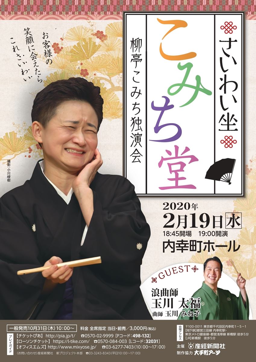 さいわい坐 こみち堂 20/2/19(水) 千代田区立内幸町ホール シェア ツイート 上演情報 ジャンル 落語/演芸 料金 3,000円 全席指定※未就学児童は入場不可 表示できるチケット情報はありません詳しくはこちら キャスト&スタッフ 出演 柳亭こみち ゲスト 玉川太福 玉川みね子 お問い合わせ 産経新聞社 新プロジェクト本部 シェア ツイート