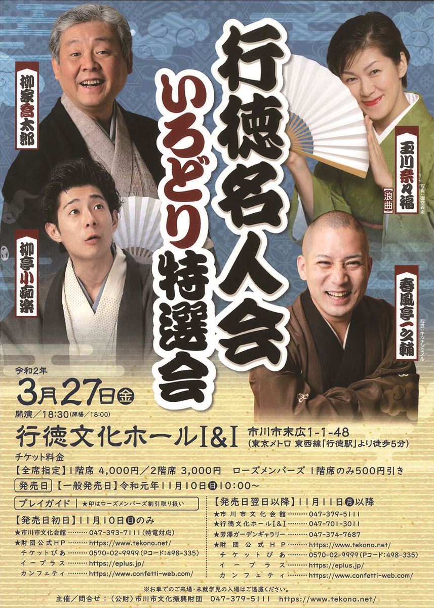 【公演中止】喬太郎・奈々福・一之輔・小痴楽 行徳名人会 ~いろどり特選会~ 20/5/28(木) 行徳文化ホール I&I シェア ツイート 噺家の柳家喬太郎・春風亭一之輔・柳亭小痴楽と、浪曲師・曲師の玉川奈々福がおくるとびきりの舞台。当代の演芸界きっての人気者たちが集結して、それぞれの技をぶつけあう。 上演情報 ジャンル 落語/演芸 料金 1階席-4,000円2階席-3,000円 全席指定※未就学児の入場不可。 表示できるチケット情報はありません詳しくはこちら キャスト&スタッフ 出演 柳家喬太郎 玉川奈々福 春風亭一之輔 柳亭小痴楽 お問い合わせ 市川市文化振興財団 公式サイト シェア ツイート