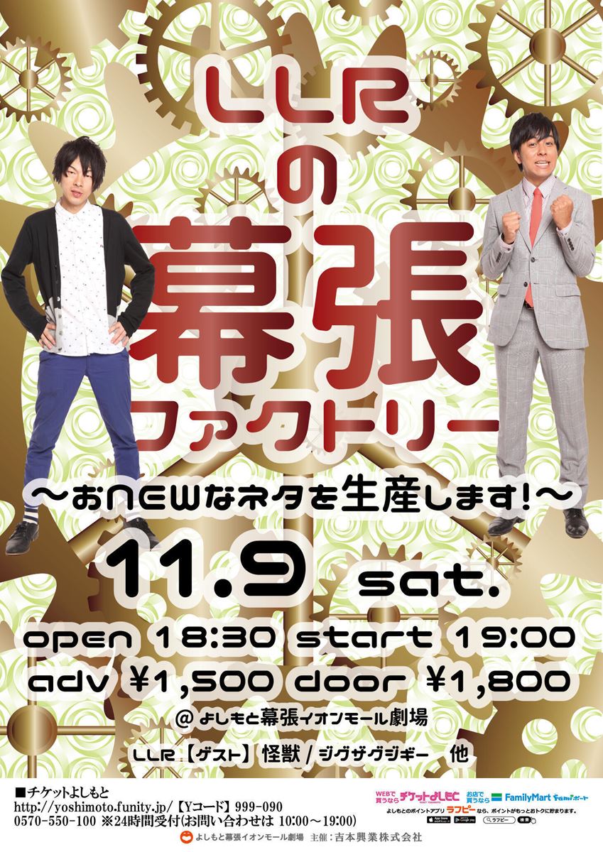 『 LLRの幕張ファクトリー~おNEWなネタを生産します!~』よしもと幕張イオンモール劇場イベントライブ 11月 19/11/9(土) よしもと幕張イオンモール劇場 シェア ツイート 上演情報 ジャンル お笑い 20:15終演予定 料金 前売-1,500円当日-1,800円 全席指定4歳以下(身長110cm以下)はひざ上のみ無料車いすの方はチケット購入前に問い合わせ先まで要連絡 表示できるチケット情報はありません詳しくはこちら キャスト&スタッフ 出演 LLR ゲスト ジグザグジギー [出演]LLR [ゲスト]怪獣 / ジグザグジギー / 他 お問い合わせ チケットよしもと予約問合せダイヤル 10:00~19:00 公式サイト シェア ツイート