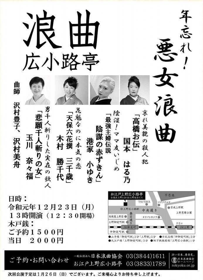 奈々福・勝千代・小ゆき 浪曲広小路亭「年忘れ! 悪女浪曲の会」 19/12/23(月) お江戸上野広小路亭 シェア ツイート 上演情報 ジャンル 落語/演芸 【演目】 国本はる乃 「高橋お伝」 港家小ゆき 「最強主婦伝説 陰謀の赤ずきん」 木村勝千代 「天保六花撰 三千歳」 玉川奈々福 「悲願千人斬りの女」 曲師:沢村豊子、沢村美船 料金 予約-1,500円当日-2,000円 キャスト&スタッフ 出演 玉川奈々福 国本はる乃 港家小ゆき 木村勝千代 沢村豊子 沢村美船 お問い合わせ 一般社団法人 日本浪曲協会 お江戸上野広小路亭 シェア ツイート