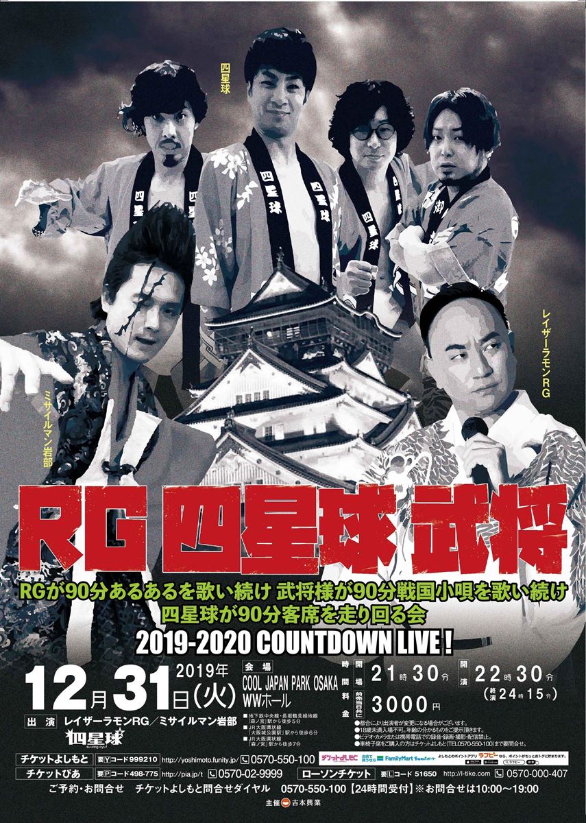RGが90分あるあるを歌い続け武将様が90分戦国小唄を歌い続け四星球が90分客席を走り回る会 19/12/31(火) COOL JAPAN PARK OSAKA WWホール シェア ツイート 上演情報 ジャンル お笑い 料金 一般-3,000円 全席指定18歳未満は入場不可、当日要身分証提示車いすの方は購入前にチケットよしもと予約問合せダイヤルまで要問合せ 表示できるチケット情報はありません詳しくはこちら キャスト&スタッフ 出演 レイザーラモンRG ミサイルマン・岩部 四星球 [出演]レイザーラモンRG / ミサイルマン・岩部 / 四星球 お問い合わせ チケットよしもと予約問合せダイヤル 10:00~19:00 公式サイト シェア ツイート