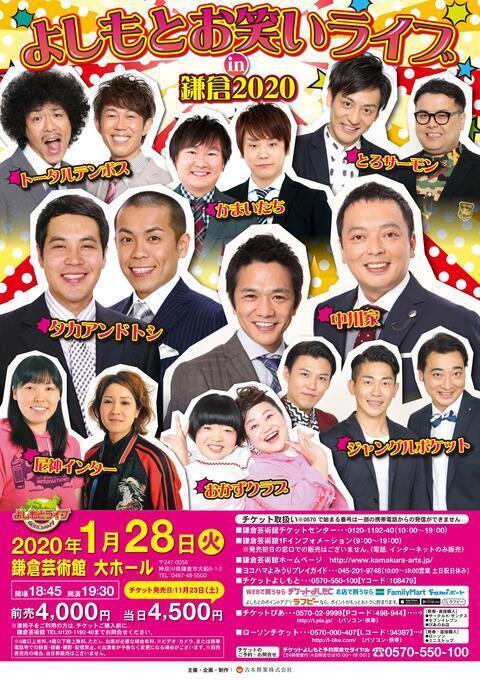 よしもとお笑いライブin鎌倉2020 20/1/28(火) 鎌倉芸術館 大ホール シェア ツイート 上演情報 ジャンル お笑い 料金 前売-4,000円当日-4,500円 全席指定4歳以下は膝上無料、席が必要な場合はチケット必要車いすの方は購入前に鎌倉芸術館まで要問合せ 表示できるチケット情報はありません詳しくはこちら キャスト&スタッフ 出演 中川家 タカアンドトシ トータルテンボス とろサーモン かまいたち ジャングルポケット 尼神インター おかずクラブ [出演]中川家 / タカアンドトシ / トータルテンボス / とろサーモン / かまいたち / ジャングルポケット / 尼神インター / おかずクラブ お問い合わせ チケットよしもと予約問合せダイヤル 10:00~19:00 鎌倉芸術館 9:00~19:00 公式サイト シェア ツイート