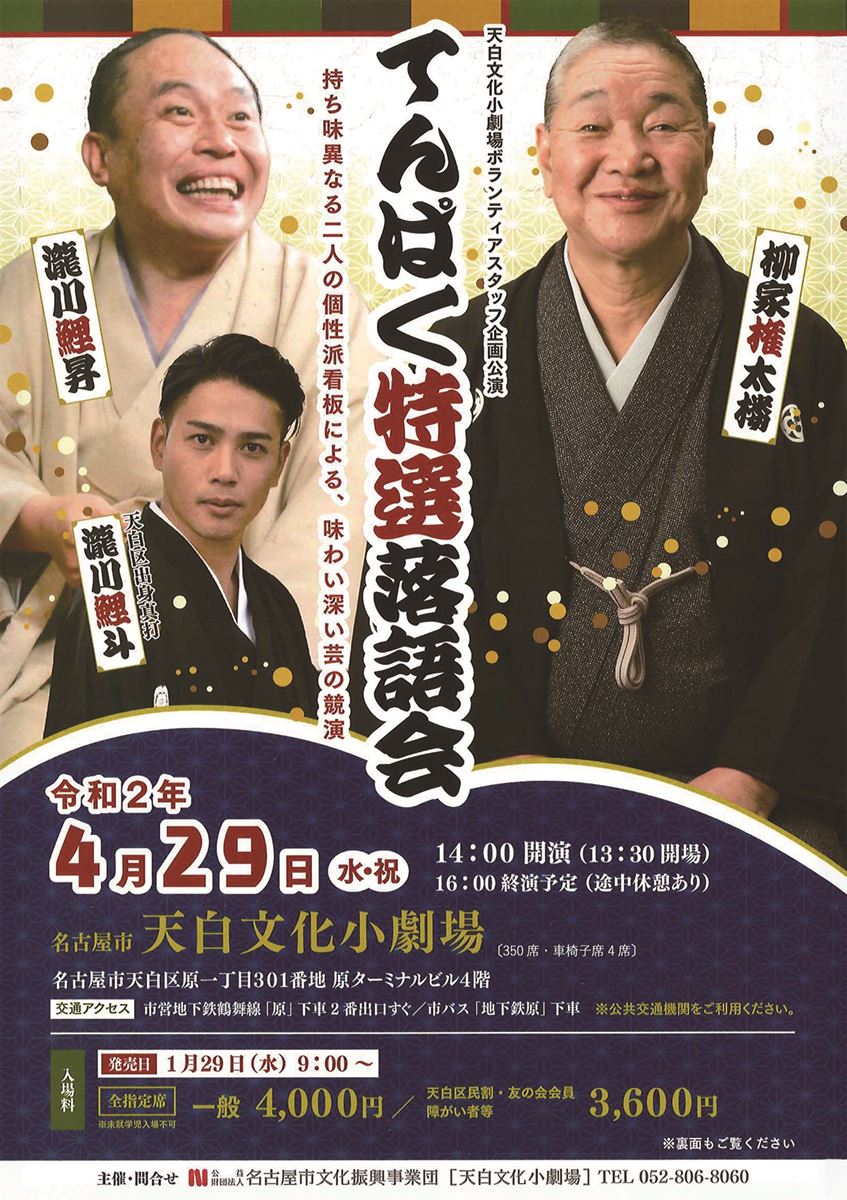 【公演中止】てんぱく特選落語会 20/8/29(土) 名古屋市天白文化小劇場 シェア ツイート 上演情報 ジャンル 落語/演芸 料金 一般-4,000円 全席指定※未就学児の入場不可※車イス席あり。但し、ぴあでの取扱いなし。詳細は問合せ先まで 表示できるチケット情報はありません詳しくはこちら キャスト&スタッフ 出演 柳家権太楼 瀧川鯉昇 瀧川鯉斗 お問い合わせ 名古屋市天白文化小劇場 シェア ツイート