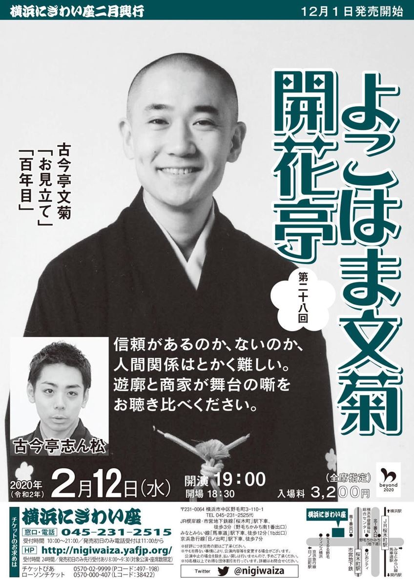 第二十八回 よこはま文菊開花亭 20/2/12(水) 横浜にぎわい座 芸能ホール シェア ツイート 上演情報 ジャンル 落語/演芸 古今亭文菊 「お見立て」「百年目」 料金 3,200円 全席指定 キャスト&スタッフ 出演 古今亭文菊 古今亭志ん橋 お問い合わせ 横浜にぎわい座 公式サイト シェア ツイート