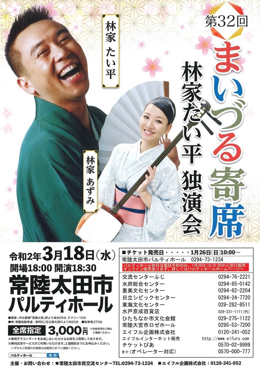 【3/18振替公演】林家たい平独演会 第32回 まいづる寄席 20/7/30(木) 常陸太田市パルティホール シェア ツイート 上演情報 ジャンル 落語/演芸 料金 3,000円 全席指定※未就学児の入場不可。※無料の託児サービスあり(問い合わせ先まで要連絡)。 キャスト&スタッフ 出演 林家たい平 林家あずみ お問い合わせ 常陸太田市民交流センター シェア ツイート