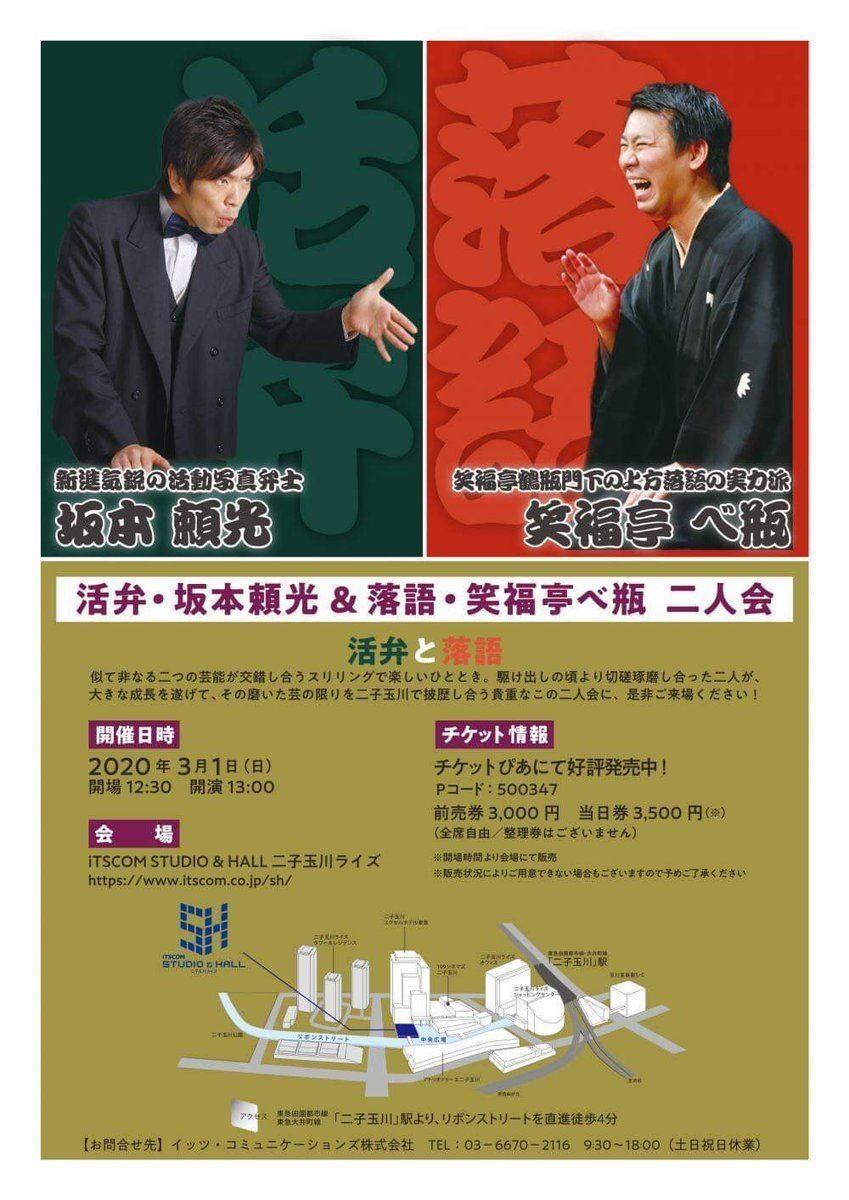 【公演中止】活弁:坂本頼光&落語:笑福亭べ瓶 二人会 20/3/1(日) iTSCOM STUDIO & HALL 二子玉川ライズ シェア ツイート 新進気鋭の活動写真弁士・坂本頼光と、上方落語の実力派・笑福亭べ瓶が、二子玉川にて二人会を開催! 上演情報 ジャンル 落語/演芸 料金 3,000円 全席自由 表示できるチケット情報はありません詳しくはこちら キャスト&スタッフ 出演 坂本頼光 笑福亭べ瓶 お問い合わせ イッツ・コミュニケーションズ株式会社 シェア ツイート