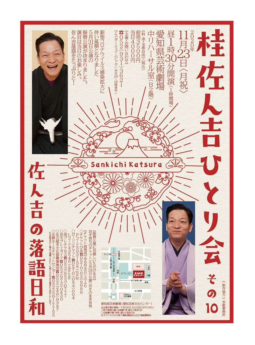 佐ん吉の落語日和 桂佐ん吉ひとり会 その十 20/11/23(月) 愛知県芸術劇場 中リハーサル室 シェア ツイート 上演情報 ジャンル 落語/演芸 料金 前売-3,500円当日-4,000円 全席自由※未就学児の入場不可。※車イス席あり、問合せ先まで要連絡。※5月31日の振替公演。 表示できるチケット情報はありません詳しくはこちら キャスト&スタッフ 出演 桂佐ん吉 お問い合わせ アスターミュージック 11:00~18:00・土日祝休 公式サイト シェア ツイート