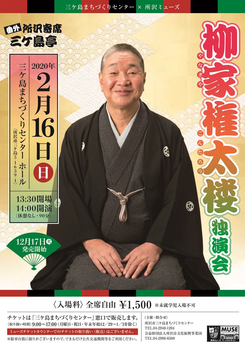 柳家権太楼 独演会 番外・所沢寄席 20/2/16(日) 三ケ島まちづくりセンター シェア ツイート 上演情報 ジャンル 落語/演芸 料金 1,500円 全席自由※未就学児の入場不可 キャスト&スタッフ 出演 柳家権太楼 お問い合わせ 所沢市三ヶ島まちづくりセンター 公益財団法人所沢市文化振興事業団 シェア ツイート