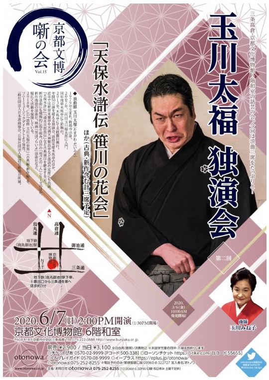 玉川太福独演会 京都文博 噺の会 Vol.15 20/6/7(日) 京都文化博物館 和室 シェア ツイート 上演情報 ジャンル 落語/演芸 『天保水滸伝 笹川の花会』ほか(古典・新作含む計三席予定) 料金 2,900円 全席自由(畳席)※未就学児の入場不可 表示できるチケット情報はありません詳しくはこちら キャスト&スタッフ 出演 玉川太福 玉川みね子 お問い合わせ オトノワ シェア ツイート