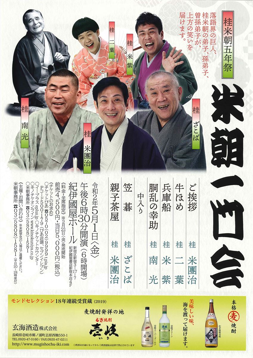 【公演中止】桂米朝五年祭 米朝一門会 20/5/1(金) 紀伊國屋ホール シェア ツイート 演目桂米團治 ご挨拶桂二葉『牛ほめ』桂米紫『兵庫船』桂南光『胴乱の幸助』 ー中入りー桂ざこば『笠碁』 桂米團治『親子茶屋』 上演情報 ジャンル 落語/演芸 料金 前売-4,500円当日-5,000円 全席指定未就学児童は入場不可 表示できるチケット情報はありません詳しくはこちら キャスト&スタッフ 出演 桂ざこば 桂南光 桂米團治 桂米紫 桂二葉 お問い合わせ 米朝事務所(東京) 公式サイト シェア ツイート