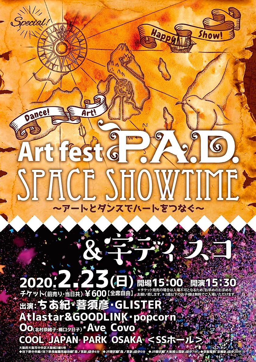 Art Fest PAD 『SPACE SHOWTIME~アートとダンスでハートをつなぐ~』 20/2/23(日) COOL JAPAN PARK OSAKA SSホール シェア ツイート 上演情報 ジャンル ダンス/バレエ 料金 一般-600円 全席自由2歳以下無料 キャスト&スタッフ [出演]ちあ紀 / 菩須彦 / GLISTER / 他 お問い合わせ ART FEST P.A.D. 公式サイト シェア ツイート