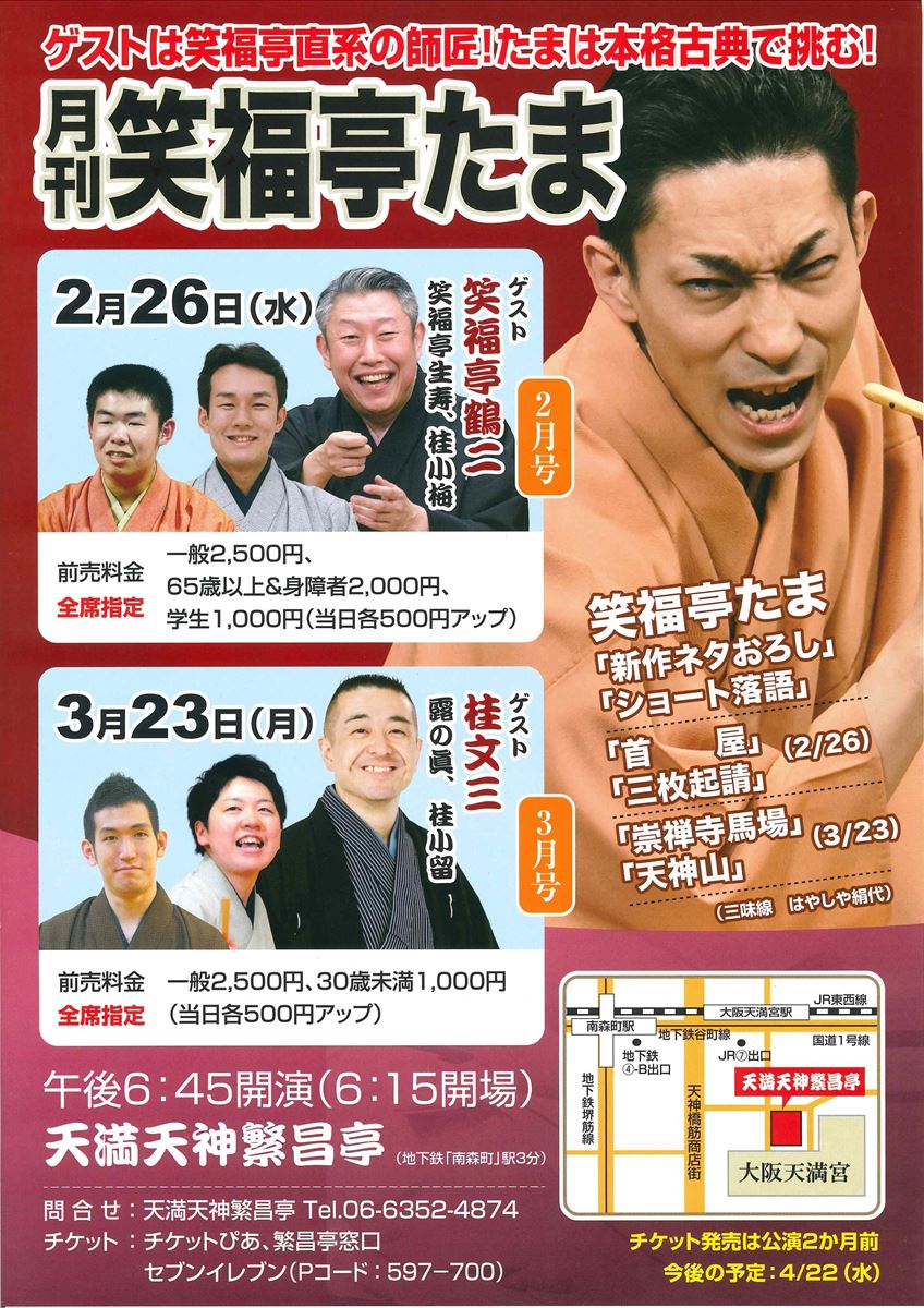 月刊 笑福亭たま2月号 20/2/26(水) 天満天神繁昌亭 シェア ツイート 演目笑福亭たま『新作ネタおろし』『ショート落語』『首屋』『三枚起請』他 上演情報 ジャンル 落語/演芸 料金 一般-2,500円65才以上・障がい者-2,000円学生-1,000円 全席指定当日+500円中学生以下保護者同伴に限る未就学児の入場不可 表示できるチケット情報はありません詳しくはこちら キャスト&スタッフ メイン 笑福亭たま ゲスト 笑福亭鶴二 笑福亭生寿 桂小梅 お問い合わせ 笑福亭たま事務所 公式サイト シェア ツイート