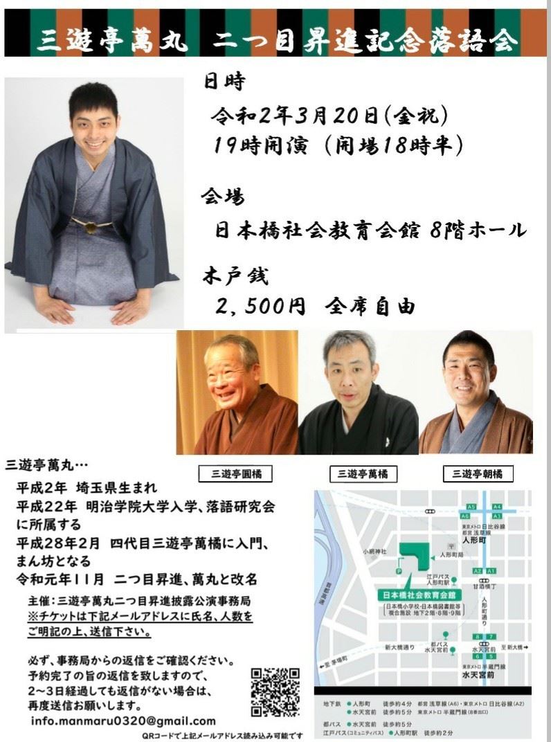 三遊亭萬丸 二ツ目昇進記念落語会 20/3/20(金) 日本橋社会教育会館 シェア ツイート 上演情報 ジャンル 落語/演芸 料金 2,500円 全席自由 キャスト&スタッフ 出演 三遊亭萬丸 三遊亭圓橘 三遊亭萬橘 三遊亭朝橘 お問い合わせ 予約 シェア ツイート