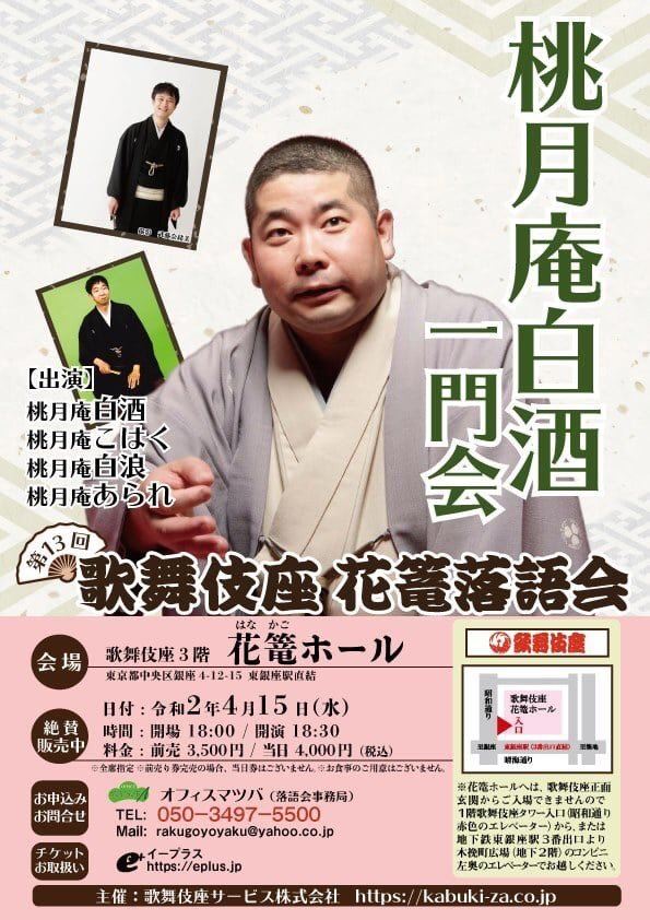 【4/15振替公演】桃月庵白酒 一門会 20/9/29(火) 歌舞伎座3階花篭 シェア ツイート 上演情報 ジャンル 落語/演芸 料金 3,500円 全席指定 キャスト&スタッフ 出演 桃月庵白酒 桃月庵こはく 桃月庵白浪 桃月庵あられ お問い合わせ オフィス マツバ シェア ツイート