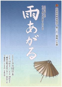 前進座附属養成所『雨あがる』第33期生修了公演 20/3/12(木) シアターX(カイ) シェア ツイート 上演情報 ジャンル 大・中劇場 料金 一般-2000円 全席自由 キャスト&スタッフ 原作 山本周五郎 脚本 津上忠 改訂・演出 鈴木龍男 [原作]山本周五郎 [脚本]津上忠 [改訂・演出]鈴木龍男 [出演]武居雪乃 / 羽島奈津実 / モハメディ亜沙南 / 他 お問い合わせ 前進座附属養成所 公式サイト シェア ツイート