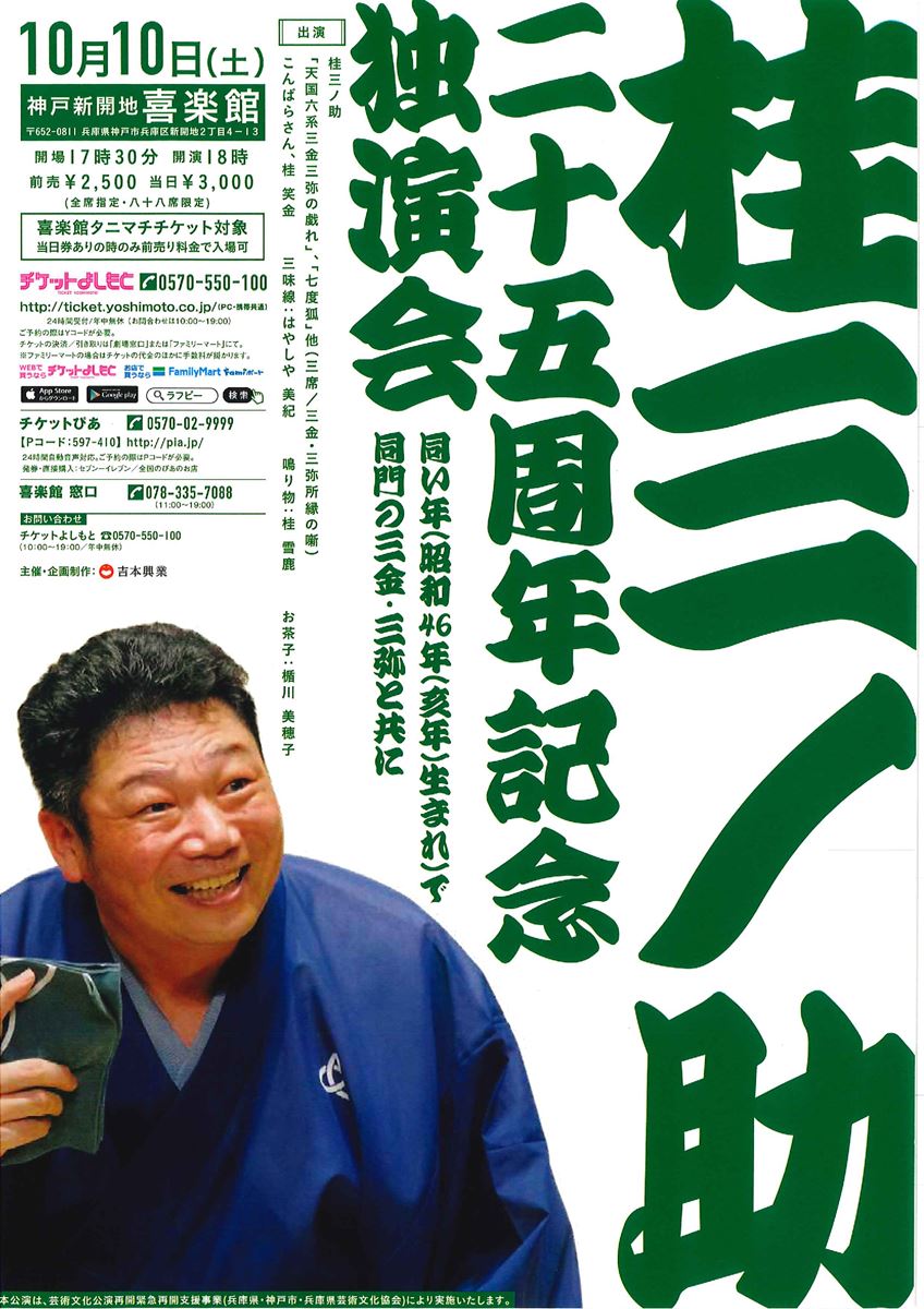 桂三ノ助 二十五周年記念独演会 20/10/10(土) 神戸新開地・喜楽館 シェア ツイート 上演情報 ジャンル 落語/演芸 桂三ノ助 『天国六系三金三弥の戯れ』 『七度狐』ほか(三席/三金・三弥所縁の噺) 料金 前売-2,500円当日-3,000円 全席指定※未就学児の入場不可。※出演者は変更になる場合があります。出演者情報等詳細は神戸新開地・喜楽館公式ホームページ(https://kobe-kirakukan.jp/)にてご確認下さい。※車椅子席をご利用の方はチケット(「昼席(火曜祭りは除く)は「障がい者・大・高生」)をご購入の上、神戸新開地・喜楽館までお問い合わせ・お申込みください。 表示できるチケット情報はありません詳しくはこちら キャスト&スタッフ 出演 桂三ノ助 桂笑金 こんばらさん お問い合わせ 神戸新開地・喜楽館 公式サイト シェア ツイート