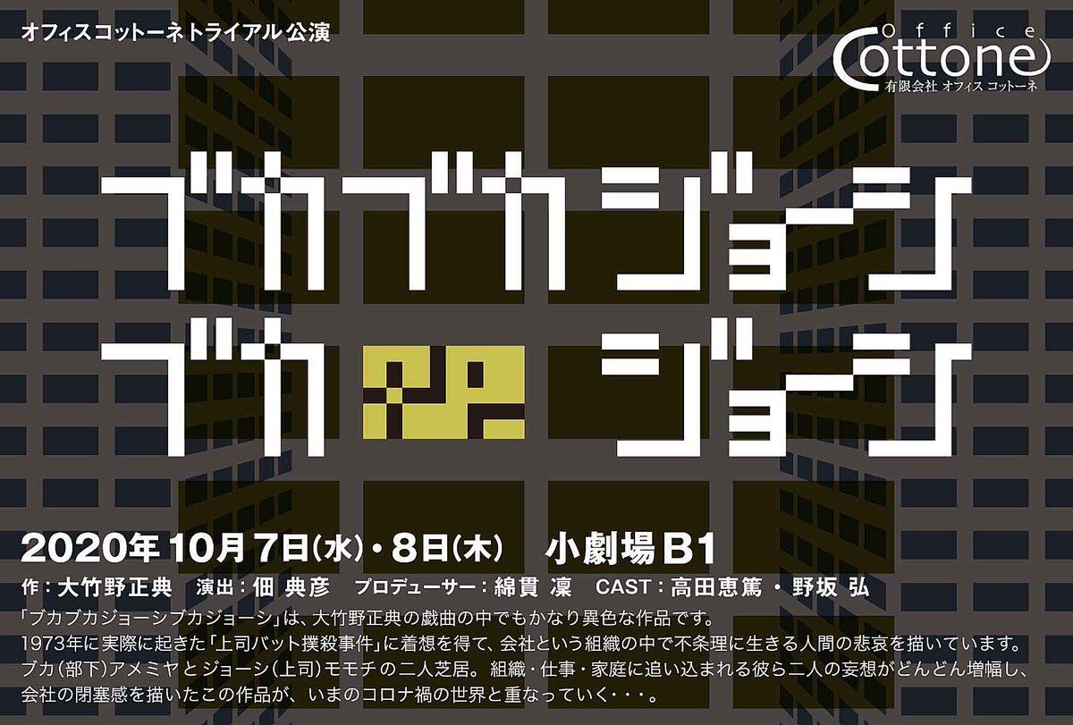オフィスコットーネトライアル公演『ブカブカジョーシブカジョーシ』 20/10/7(水)~20/10/8(木) 小劇場B1 シェア ツイート 上演情報 ジャンル 大・中劇場 上演時間:90分予定 料金 一般-4,000円 全席指定未就学児童は入場不可 キャスト&スタッフ 作 大竹野正典 演出 佃典彦 プロデューサー 綿貫凜 出演 高田恵篤 野坂弘 [作]大竹野正典 [演出]佃典彦 [プロデューサー]綿貫凜 [出演]高田恵篤 / 野坂弘 お問い合わせ (有)オフィス コットーネ 公式サイト シェア ツイート
