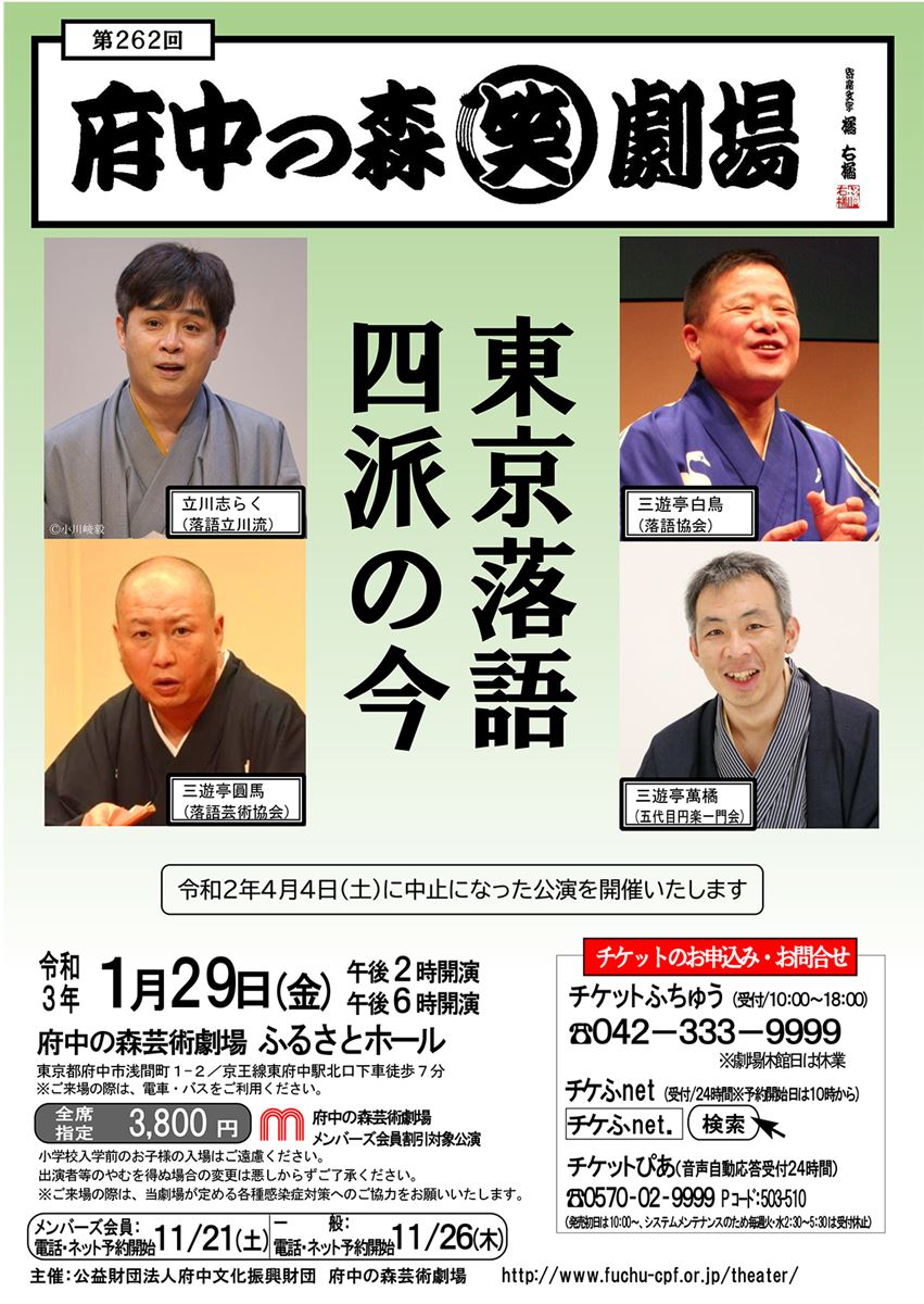 第262回 府中の森笑劇場 東京落語四派の今 21/1/29(金) 府中の森芸術劇場 ふるさとホール シェア ツイート 上演情報 ジャンル 落語/演芸 未就学児童は入場不可。車椅子席は問合せ先まで。 料金 全席指定-3,800円さじき席-3,800円 ※全席指定※未就学児の入場不可。※車椅子席は問合せ先まで。 表示できるチケット情報はありません詳しくはこちら キャスト&スタッフ 出演 立川志らく 三遊亭白鳥 三遊亭圓馬 三遊亭萬橘 [出演]立川志らく / 三遊亭白鳥 / 三遊亭圓馬 / 三遊亭萬橘 お問い合わせ チケットふちゅう予約センター 公式サイト シェア ツイート