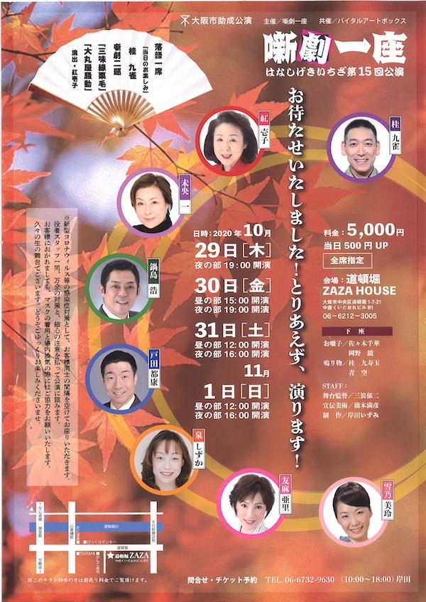 噺劇一座 20/10/29(木)~20/11/1(日) 道頓堀ZAZA HOUSE シェア ツイート 演目【落語一席】桂九雀 当日のお楽しみ【噺劇二題】三味線栗毛大丸屋騒動 上演情報 ジャンル 小劇場 落語/演芸 料金 前売-5,000円当日-5,500円 全席指定 キャスト&スタッフ 演出・出演 紅壱子 出演 桂九雀 未央一 鍋島浩 戸田都康 泉しずか 雪乃美玲 [演出]紅壱子 [出演]桂九雀 / 紅壱子 / 未央一 / 鍋島浩 / 戸田都康 / 泉しずか / 友麻亜里 / 雪乃美玲 お問い合わせ 岸田 10:00~18:00 公式サイト シェア ツイート