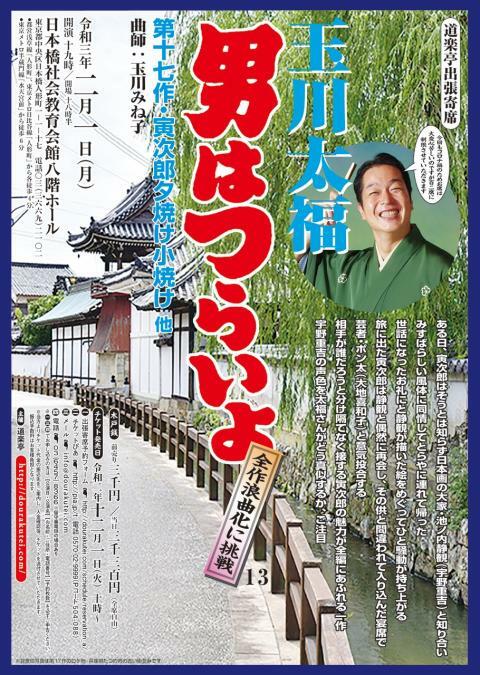玉川太福『男はつらいよ』全作浪曲化に挑戦!第十七作・寅次郎夕焼け 21/2/1(月) 日本橋社会教育会館 シェア ツイート 玉川太福さんの挑戦!今回は虎次郎の魅力が全編にあふれる一作! 上演情報 ジャンル 落語/演芸 料金 全席自由-3,000円 表示できるチケット情報はありません詳しくはこちら キャスト&スタッフ 出演 玉川太福 玉川みね子 [出演]玉川太福 / 玉川みね子 お問い合わせ 道楽亭 シェア ツイート