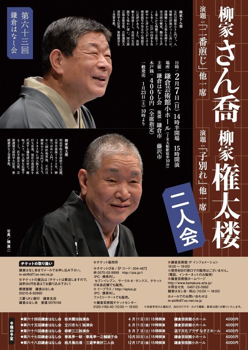 さん喬・権太楼二人会 第六十三回 鎌倉はなし会 21/2/7(日) 鎌倉芸術館 小ホール シェア ツイート 上演情報 ジャンル 落語/演芸 柳家さん喬 『二番煎じ』ほか一席柳家権太楼 『子別れ』ほか一席 料金 4,000円 ※全席指定※未就学児の入場不可。 表示できるチケット情報はありません詳しくはこちら キャスト&スタッフ 出演 柳家さん喬 柳家権太楼 お問い合わせ 鎌倉はなし会 シェア ツイート