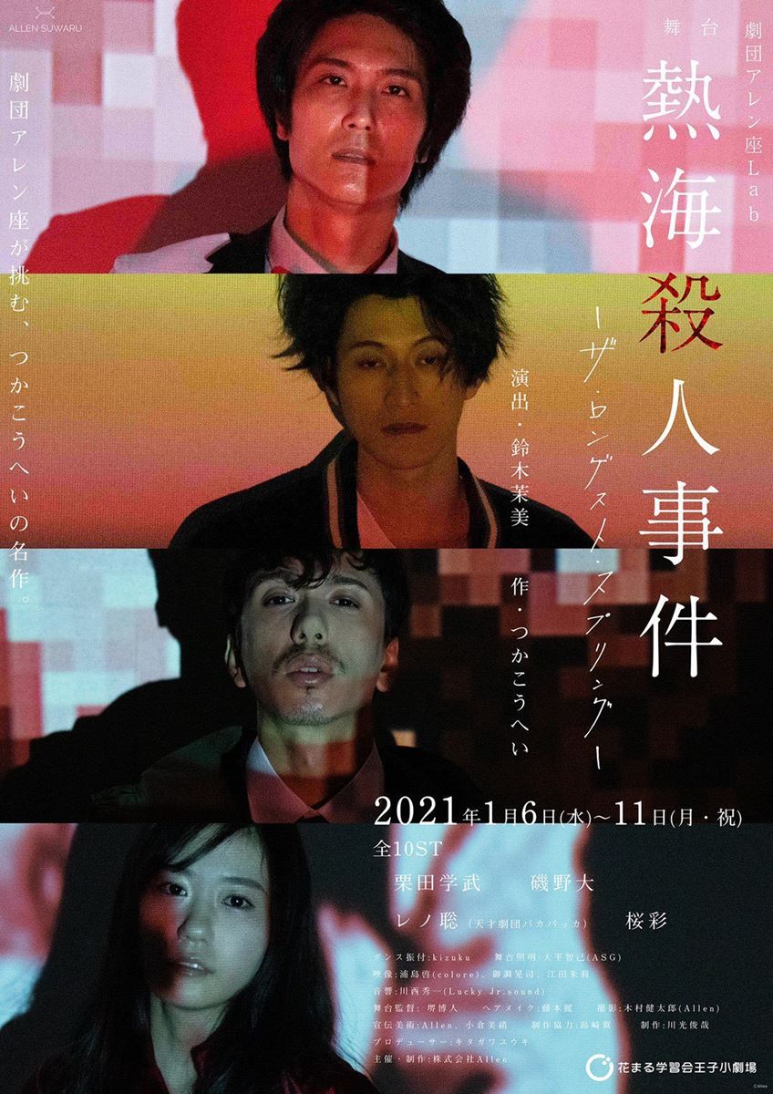 劇団アレン座Lab『熱海殺人事件 -ザ・ロンゲスト・スプリング-』【配信あり】 21/1/6(水)~21/1/11(月) 花まる学習会王子小劇場、 その他生配信 シェア ツイート 上演情報 ジャンル 小劇場 劇場に足を運ばれる方は必ず公式サイトのコロナ感染予防対策を一読ください。 料金 特典付き前方エリア-6,500円一般席エリア-5,000円学割エリア-800円【オンライン配信】オンラインチケット-4,000円 全席自由特典付き前方エリア:非売品グッズ付学割エリア:高校生以下対象 キャスト&スタッフ 原作 つかこうへい 作・演出 栗田学武 出演 磯野大 [演出]鈴木茉美 [作]つかこうへい [出演]栗田学武 / 磯野大 / レノ聡 / 桜彩 お問い合わせ 劇団アレン座 公式サイト シェア ツイート