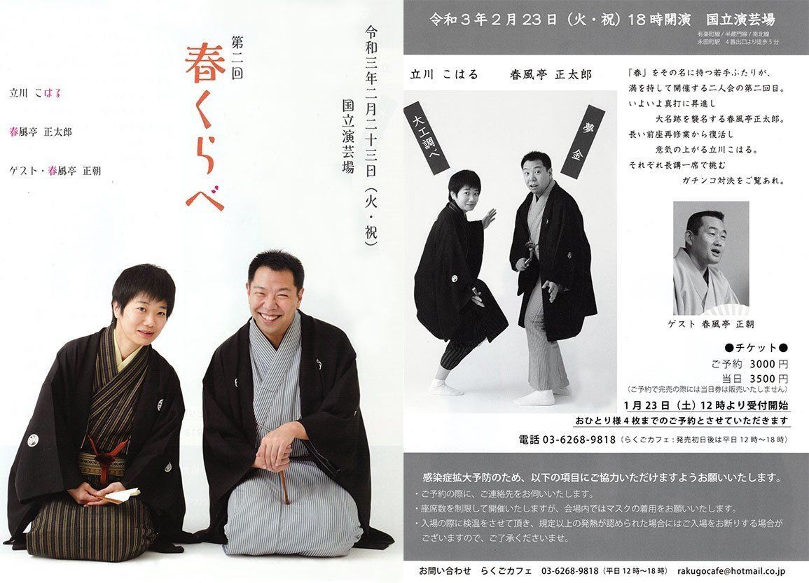 こはる・正太郎 第二回 春くらべ 21/2/23(火) 国立演芸場 シェア ツイート 上演情報 ジャンル 落語/演芸 立川こはる 『大工調べ』春風亭正太郎 『夢金』 料金 前売-3,000円当日-3,500円 ※全席指定 キャスト&スタッフ 出演 立川こはる 春風亭正太郎 ゲスト 春風亭正朝 お問い合わせ らくごカフェ 公式サイト シェア ツイート