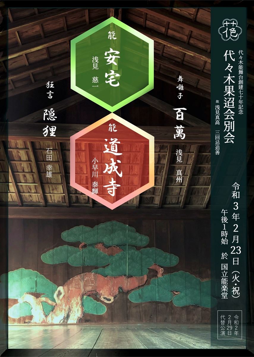 代々木能舞台創建七十年記念 故浅見眞高三回忌追善 代々木果迢会別会 21/2/23(火) 国立能楽堂 シェア ツイート 演目舞囃子『百萬』浅見真州能『安宅勧進帳』浅見慈一狂言『隠狸』石田幸雄能『道成寺』小早川泰輝 上演情報 ジャンル 能/狂言 料金 SS席-15,000円S席-13,000円A席-11,000円B席-8,000円C席-6,000円学生席-各3,000円引き 学生席:30歳未満、要学生証提示 キャスト&スタッフ 出演 浅見真州 浅見慈一 石田幸雄 小早川泰輝 [出演]浅見真州 / 浅見慈一 / 石田幸雄 / 小早川泰輝 / 他 お問い合わせ 銕仙会 10:00~17:00・土日祝休 公式サイト シェア ツイート