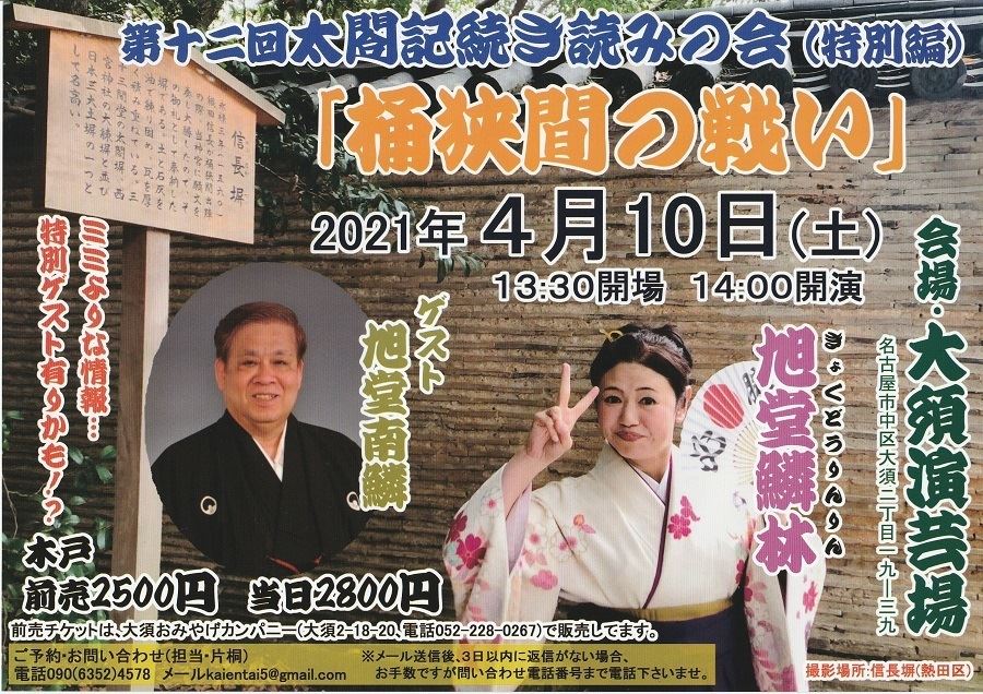 第十二回太閤記続き読みの会(特別編)『桶狭間の戦い』 21/4/10(土) 大須演芸場 シェア ツイート 上演情報 ジャンル 落語/演芸 料金 前売-2,500円当日-2,800円 キャスト&スタッフ 出演 旭堂鱗林 ゲスト 旭堂南鱗 [出演]旭堂鱗林 [ゲスト]旭堂南鱗 お問い合わせ 担当・片桐 担当・片桐 公式サイト シェア ツイート