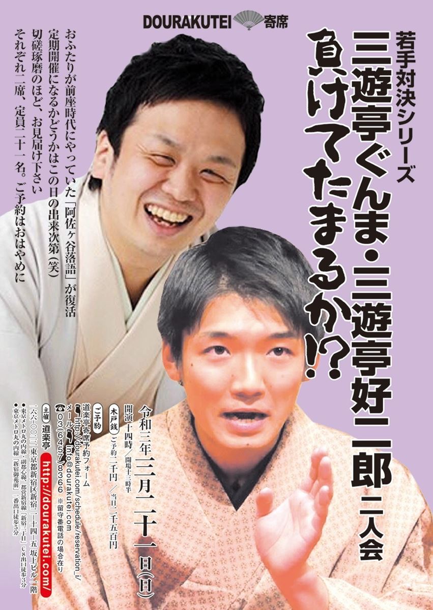 三遊亭ぐんま・三遊亭好二郎 二人会『負けてたまるか!?』【配信あり】 21/3/21(日)~21/3/24(水) 道楽亭(Ryu's Bar)、 その他生配信 シェア ツイート 上演情報 ジャンル 落語/演芸 料金 木戸銭-2,000円当日-2,500円オンライン視聴料-2,000円 キャスト&スタッフ 出演 三遊亭ぐんま 三遊亭好二郎 [出演]三遊亭ぐんま / 三遊亭好二郎 お問い合わせ 道楽亭 公式サイト シェア ツイート