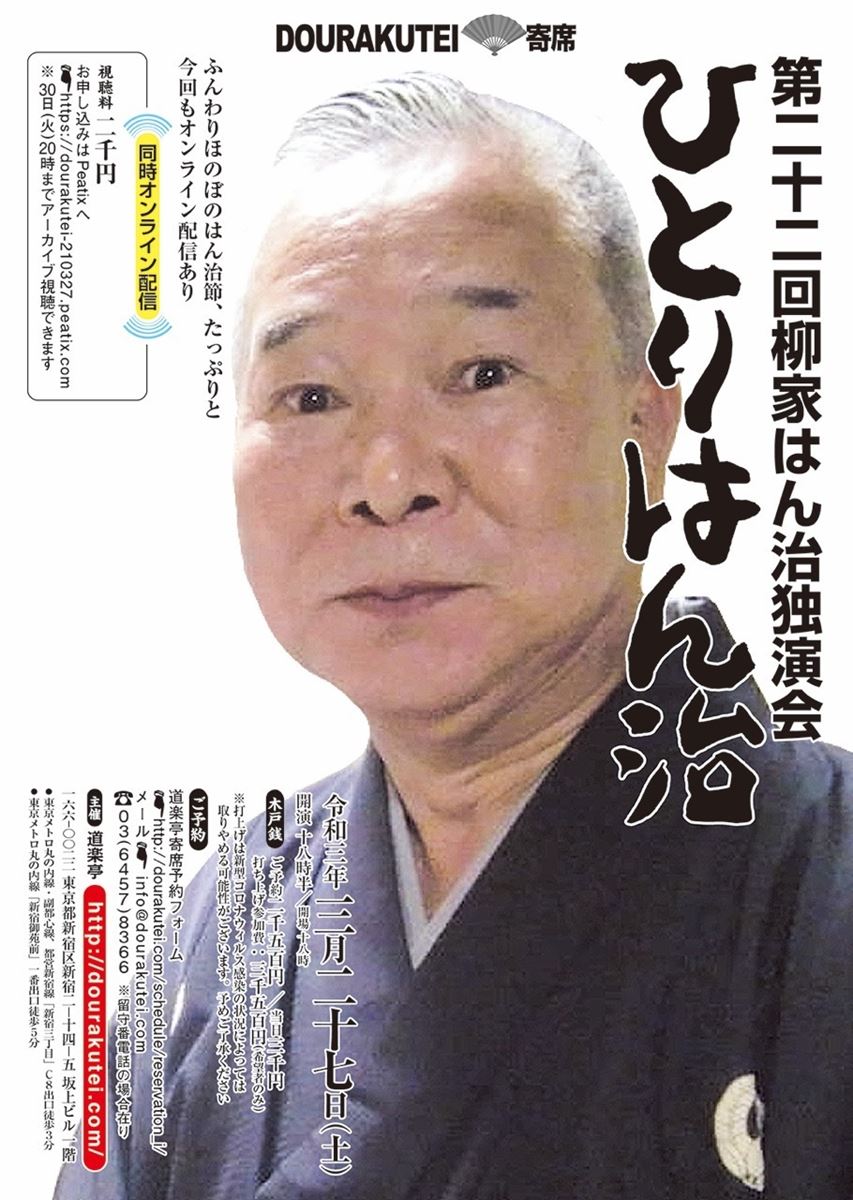 柳家はん治 独演会『ひとりはん治』【配信あり】 21/3/27(土)~21/3/30(火) 道楽亭(Ryu's Bar)、 その他生配信 シェア ツイート 上演情報 ジャンル 落語/演芸 打ち上げあり(希望者のみ)参加費-3,500円 料金 木戸銭-2,500円当日-3,000円オンライン視聴料-2,000円 キャスト&スタッフ 出演 柳家はん治 [出演]柳家はん治 お問い合わせ 道楽亭 公式サイト シェア ツイート