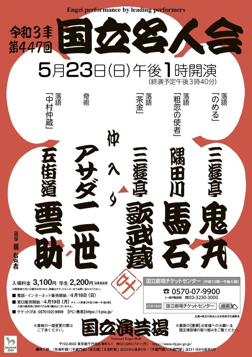 第447回 国立名人会 21/5/23(日) 国立演芸場 シェア ツイート 上演情報 ジャンル 落語/演芸 料金 一般-3,100円学生-2,200円 全席指定 表示できるチケット情報はありません詳しくはこちら キャスト&スタッフ 出演 五街道雲助 アサダ二世 三遊亭歌武蔵 隅田川馬石 三遊亭鬼丸 [出演]五街道雲助 / アサダ二世 / 三遊亭歌武蔵 / 隅田川馬石 / 三遊亭鬼丸 お問い合わせ 国立劇場チケットセンター 10:00~18:00 国立劇場チケットセンター(一部IP電話等) 10:00~18:00 公式サイト シェア ツイート