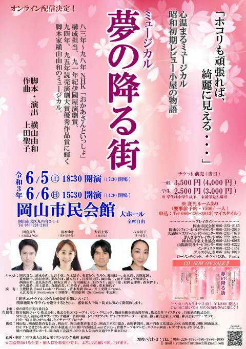 ミュージカル「夢の降る街」 21/6/5(土)~21/6/6(日) 岡山市民会館 シェア ツイート 心温まるミュージカル。「ホコリも頑張れば綺麗に見える...」昭和初期レビュー小屋の物語。 上演情報 ジャンル ミュージカル 未就学児入場可。託児ルームあり(要事前予約\500/お一人様)。お申し込みは086-226-3043へ。新型コロナウィルス感染拡大・防止に努めて開催致します。 料金 一般(一般)-3,500円 一般中学生以下-2,500円 表示できるチケット情報はありません詳しくはこちら キャスト&スタッフ 出演 四宮貴久 清水ゆき 大岩主弥 八木景子 [出演]四宮貴久 / 清水ゆき / 大岩主弥 / 八木景子 お問い合わせ ミュージカル夢の降る街実行委員会 シェア ツイート