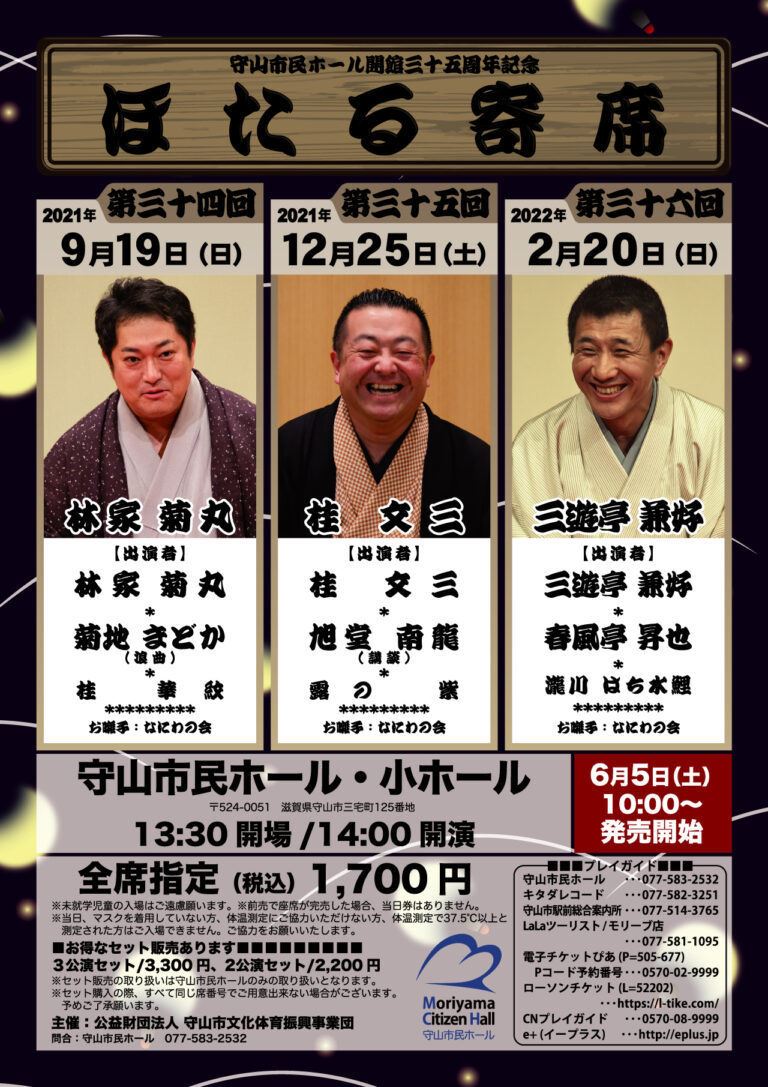ほたる寄席 21/9/19(日)~22/2/20(日) 守山市民ホール 小ホール シェア ツイート 上演情報 ジャンル 落語/演芸 セット券は取り扱いなし。未就学児童は入場不可。当日、マスクを着用していない方、検温測定にご協力いただけない方、体温測定で37.5度以上と測定された方は入場できません。 料金 全席指定-1,700円 表示できるチケット情報はありません詳しくはこちら キャスト&スタッフ 出演 林家菊丸 菊地まどか 桂華紋 なにわの会 桂文三 旭堂南青 露の紫 三遊亭兼好 春風亭昇也 瀧川蛙朝 お問い合わせ 守山市民ホール 9:00~17:00 公式サイト シェア ツイート