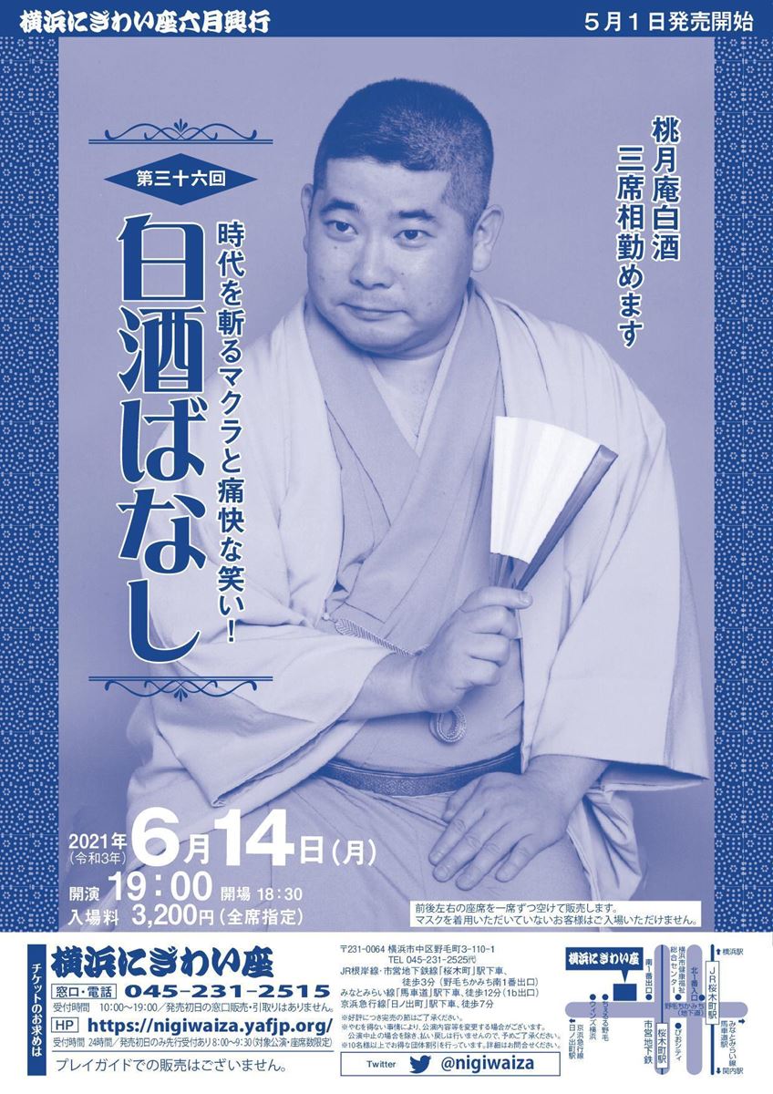 第三十六回 白酒ばなし 21/6/14(月) 横浜にぎわい座 芸能ホール シェア ツイート 上演情報 ジャンル 落語/演芸 料金 一般-3,200円 全席指定 キャスト&スタッフ 出演 桃月庵白酒 [出演]桃月庵白酒 お問い合わせ 横浜にぎわい座 10:00~19:00 公式サイト シェア ツイート