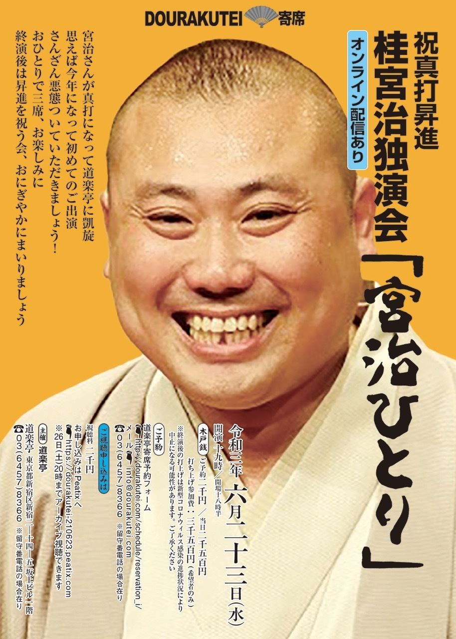 桂宮治 独演会『宮治ひとり』【配信あり】 21/6/23(水)~21/6/26(土) 道楽亭(Ryu's Bar)、 その他生配信 シェア ツイート 上演情報 ジャンル 落語/演芸 打ち上げあり(希望者のみ)参加費-3,500円 料金 木戸銭-2,000円オンライン視聴料-2,000円 当日+500円 キャスト&スタッフ 出演 桂宮治 [出演]桂宮治 お問い合わせ 道楽亭 公式サイト シェア ツイート