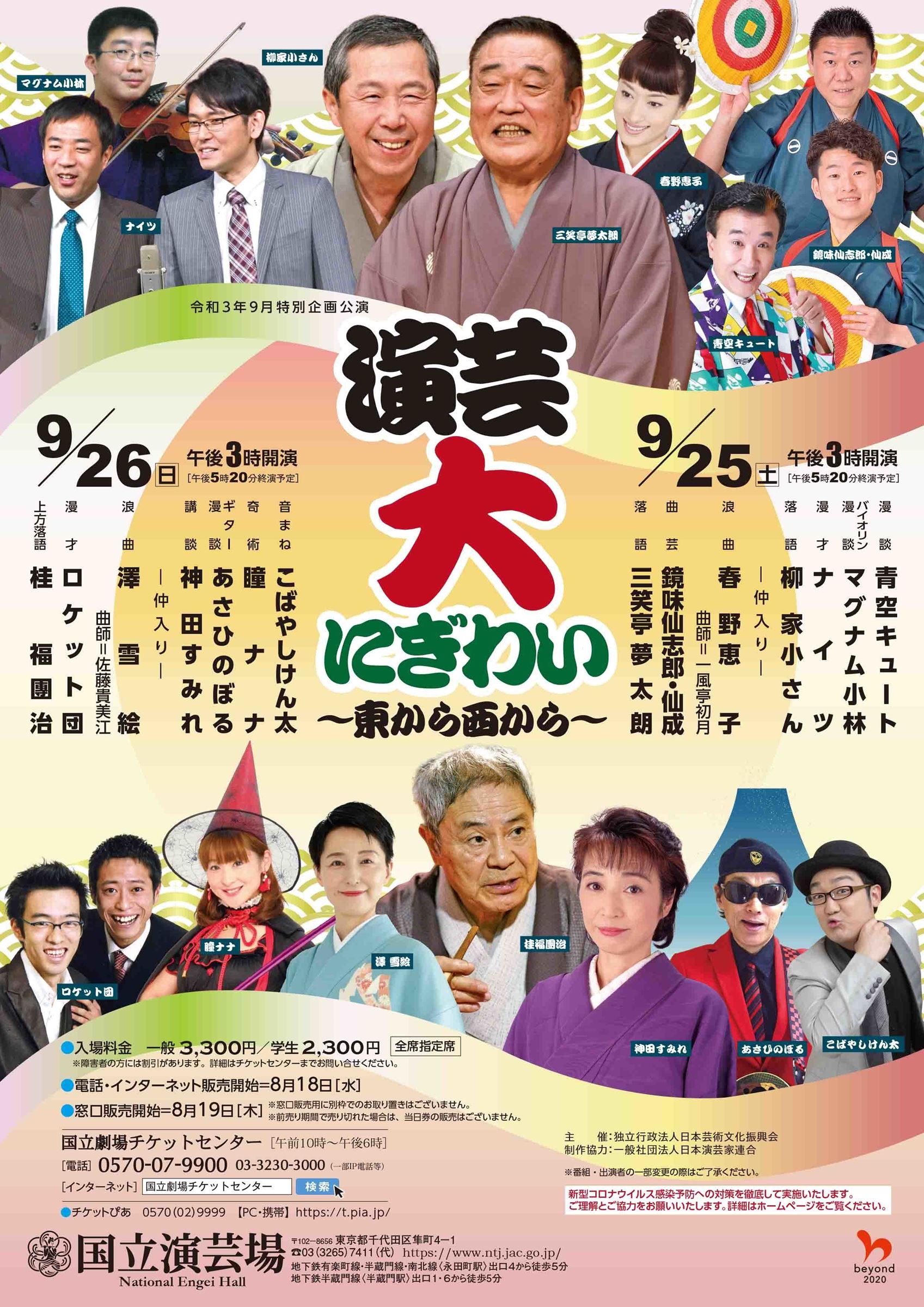 国立演芸場 特別企画公演 演芸大にぎわい ~東から西から~ 21/9/25(土)~21/9/26(日) 国立演芸場 シェア ツイート 上演情報 ジャンル 落語/演芸 料金 一般-3,300円学生-2,300円 全席指定 表示できるチケット情報はありません詳しくはこちら キャスト&スタッフ 出演 三笑亭夢太朗 鏡味仙志郎 鏡味仙成 春野恵子 柳家小さん ナイツ マグナム小林 青空キュート 桂福団治 ロケット団 澤雪絵 神田すみれ あさひのぼる 瞳ナナ こばやしけん太 お問い合わせ 国立劇場チケットセンター 公式サイト シェア ツイート