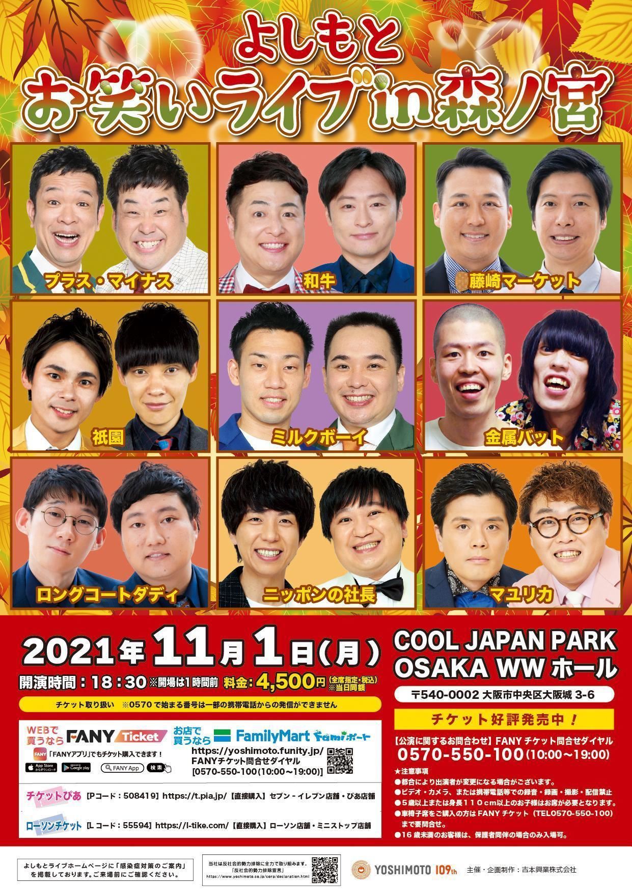 5歳以上または身長110cm以上の方はお席が必要となります。(膝上でのお子様の観劇は1名様のみ可能です。)16歳未満の方は保護者同伴に限り入場可。(終演が19時を超える公演のみ)必ずマスク着用と、入場時に手指の消毒をお願いします。検温により入場をお断りさせて頂く場合がございます。録音・録画・撮影・配信・飲食禁止。都合により出演者が変更になる場合がございます。変更・払戻不可。開演時間は多少前後する場合がございますのでご了承ください。よしもとライブHPに「感染症予防対策のご案内」を掲載しております。来場前にご確認ください。車椅子の方はチケット購入前に要問合せ。