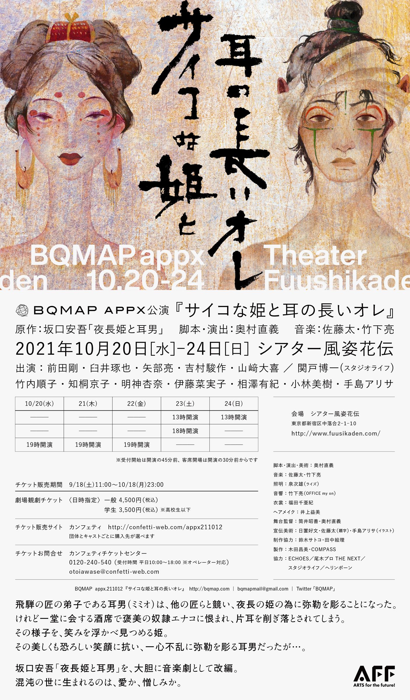 BQMAP appx.211012 『サイコな姫と耳の長いオレ』 21/10/20(水)~21/10/24(日) シアター風姿花伝 シェア ツイート 上演情報 ジャンル 小劇場 料金 一般-4,500円学生-3,500円 学生:高校生以下 キャスト&スタッフ 脚本・演出 奥村直義 出演 前田剛 [脚本・演出]奥村直義 [出演]前田剛 / 臼井琢也 / 矢部亮 / 他 お問い合わせ BQMAP 公式サイト シェア ツイート