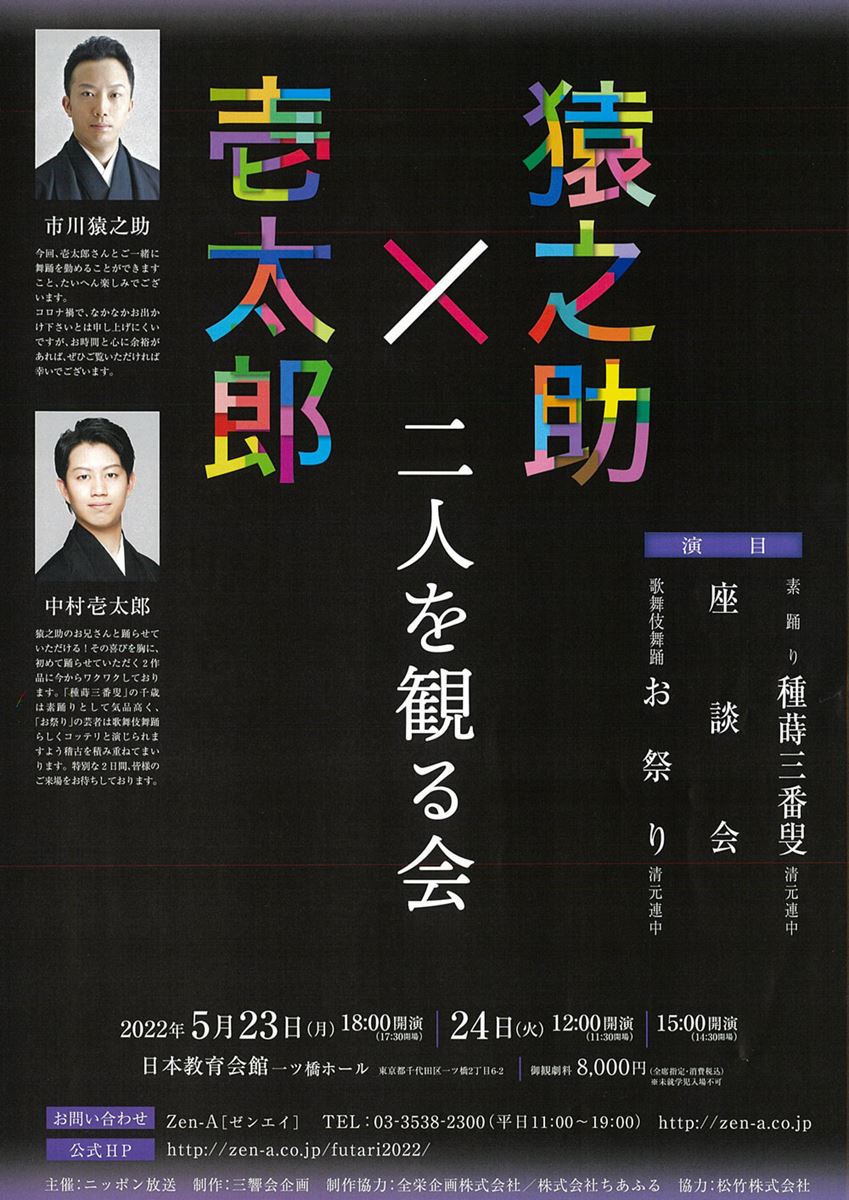 猿之助×壱太郎『二人を観る会』 22/5/23(月)~22/5/24(火) 日本教育会館 一ツ橋ホール シェア ツイート 【演目】素踊り「種蒔三番叟」清元連中座談会歌舞伎舞踊「お祭り」清元連中 上演情報 ジャンル 歌舞伎 未就学児童は入場不可。 料金 一般-8,000円当日引換券-8,000円 全席指定 表示できるチケット情報はありません詳しくはこちら キャスト&スタッフ 出演 市川猿之助 中村壱太郎 [出演]市川猿之助 / 中村壱太郎 お問い合わせ Zen-A(ゼンエイ) 公式サイト シェア ツイート