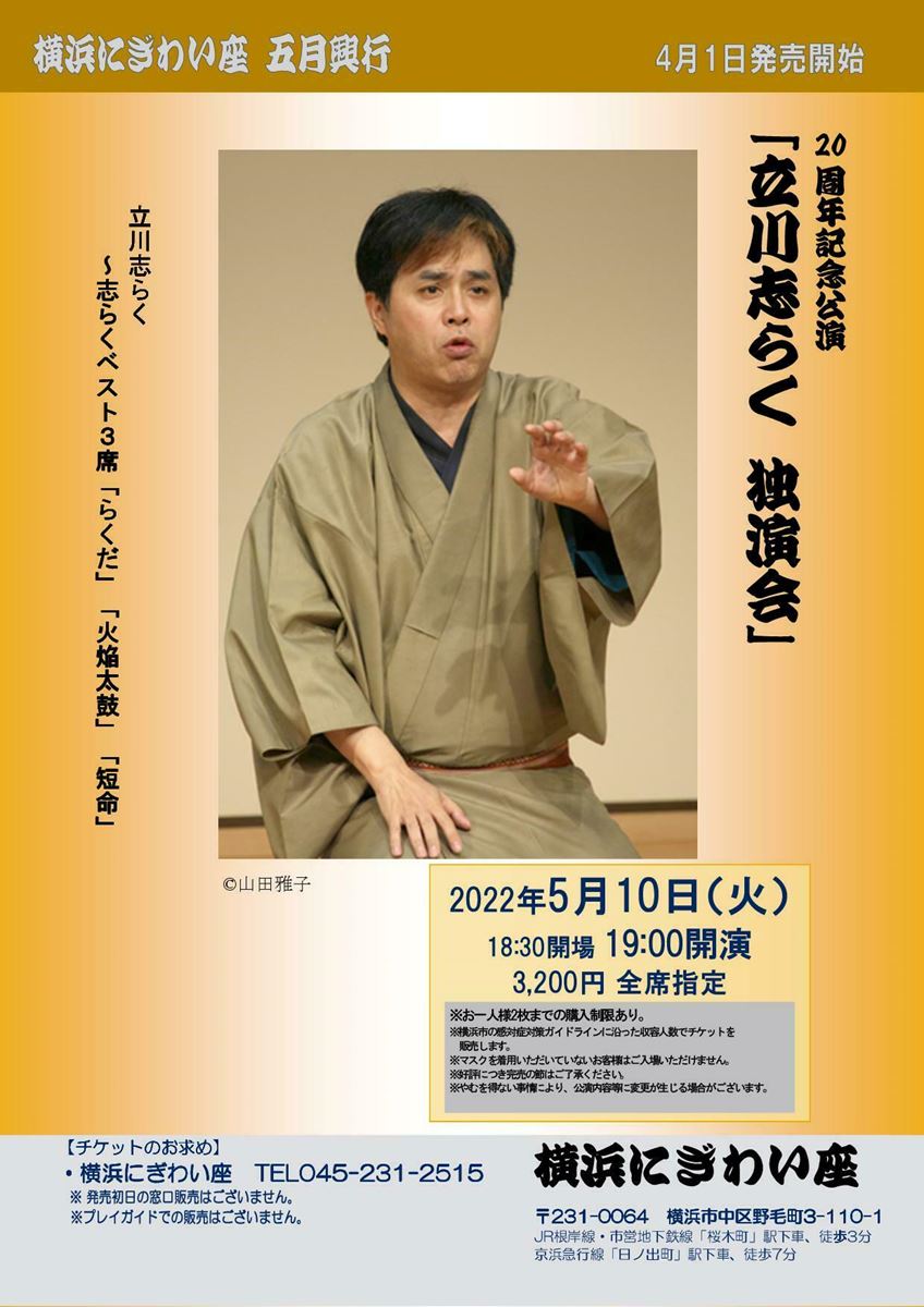 20周年記念公演 立川志らく独演会 22/5/10(火) 横浜にぎわい座 芸能ホール シェア ツイート 演目『らくだ』『火焔太鼓』『短命』 上演情報 ジャンル 落語/演芸 料金 一般-3,200円 全席指定 キャスト&スタッフ 出演 立川志らく お問い合わせ 横浜にぎわい座 10:00~19:00 公式サイト シェア ツイート