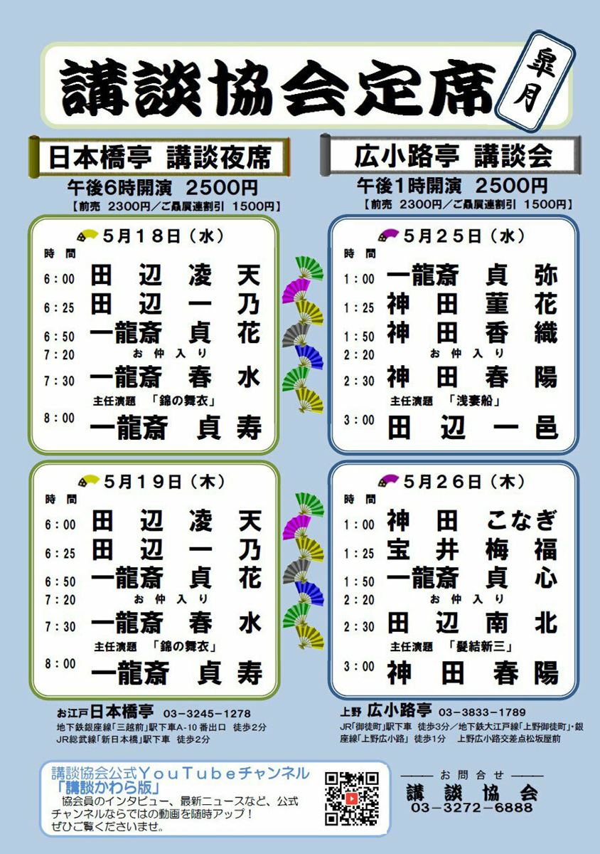 講談協会『広小路亭講談会』 22/5/25(水)~22/5/26(木) お江戸上野広小路亭 シェア ツイート 上演情報 ジャンル 落語/演芸 料金 前売-2,300円当日-2,500円 キャスト&スタッフ 出演 一龍齋貞弥 神田香織 神田春陽 田辺一邑 一龍斎貞心 [出演]一龍齋貞弥 / 神田香織 / 神田春陽 / 他※公演日時によって出演者が異なります、詳細は公式サイトにてご確認ください お問い合わせ お江戸上野広小路亭 11:00~20:00・不定休 公式サイト シェア ツイート