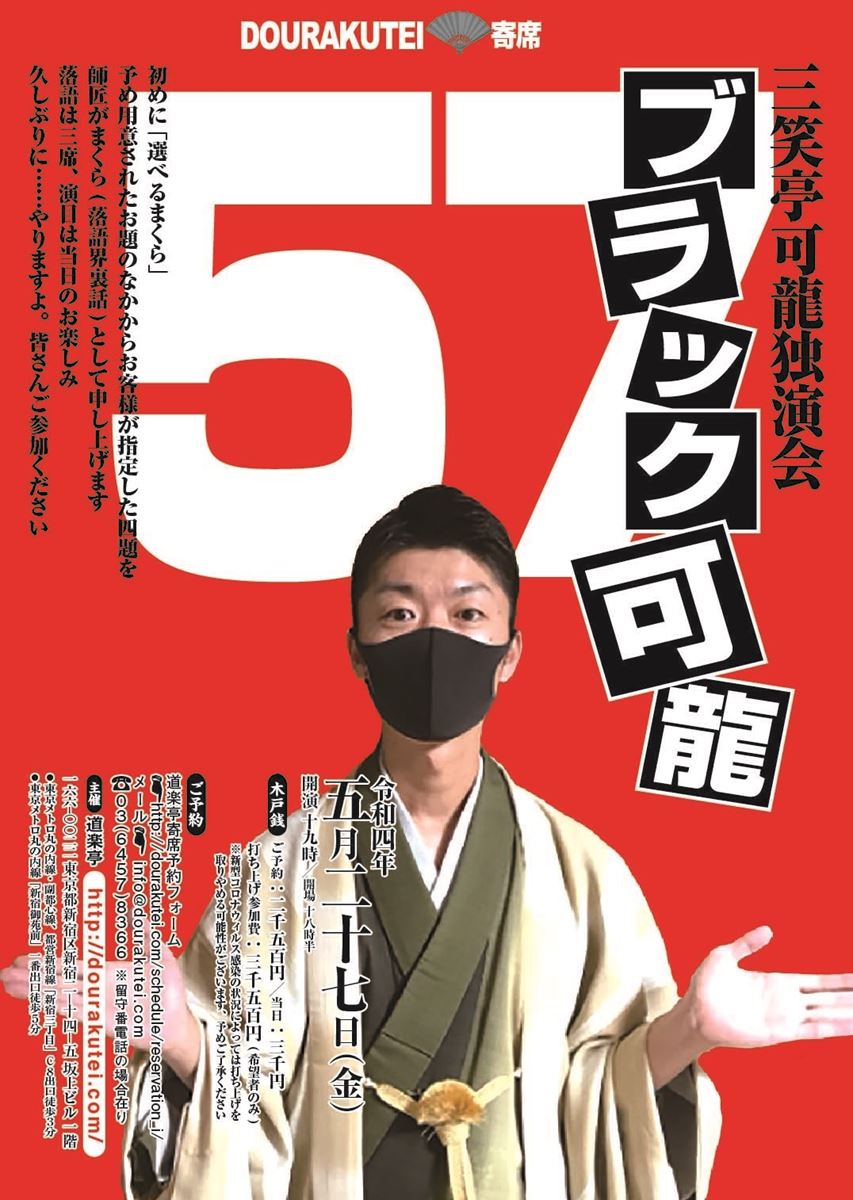 三笑亭可龍 独演会『ブラック可龍』 22/5/27(金) 道楽亭(Ryu's Bar) シェア ツイート 上演情報 ジャンル 落語/演芸 打ち上げあり(希望者のみ)参加費-3,500円 料金 木戸銭-2,500円当日-3,000円 キャスト&スタッフ 出演 三笑亭可龍 [出演]三笑亭可龍 お問い合わせ 道楽亭 公式サイト シェア ツイート