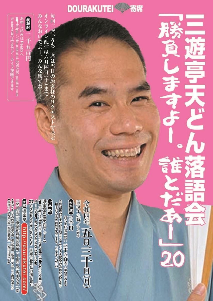 三遊亭天どん 独演会『勝負しますよー。誰とだあー』【配信あり】 22/5/30(月)~22/6/4(土) 道楽亭(Ryu's Bar)、 その他生配信 シェア ツイート 上演情報 ジャンル 落語/演芸 打ち上げあり(希望者のみ)参加費-3,500円 料金 木戸銭-3,000円オンライン視聴料-2,500円 キャスト&スタッフ 出演 三遊亭天どん [出演]三遊亭天どん お問い合わせ 道楽亭 公式サイト シェア ツイート