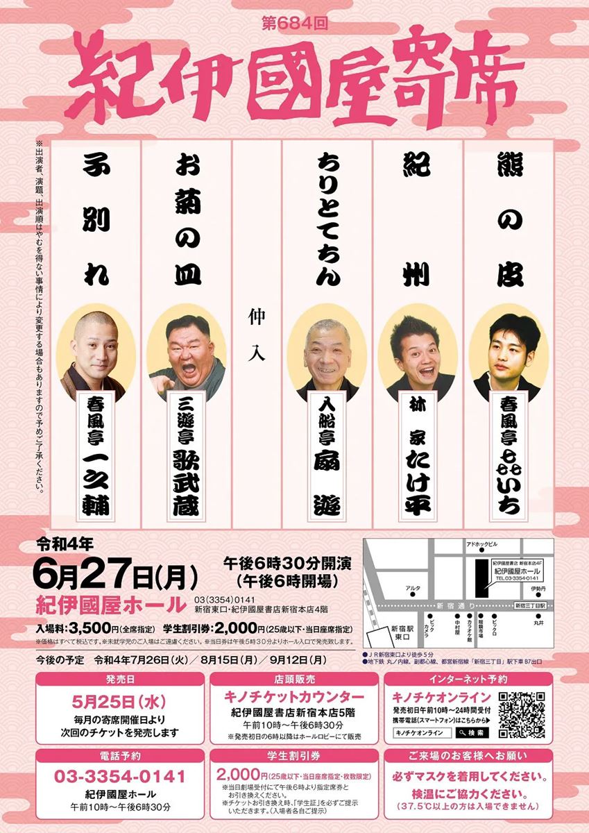 第684回 紀伊國屋寄席 22/6/27(月) 紀伊國屋ホール シェア ツイート 演目『熊の皮』 春風亭㐂いち『紀州』 林家たけ平『ちりとてちん』入船亭扇遊『お菊の皿』 三遊亭歌武蔵『子別れ』 春風亭一之輔 上演情報 ジャンル 落語/演芸 料金 一般-3,500円学生割引券-2,000円 全席指定学生割引券:25歳以下未就学児の入場は不可 キャスト&スタッフ 出演 林家たけ平 入船亭扇遊 三遊亭歌武蔵 春風亭一之輔 お問い合わせ 紀伊國屋ホール 公式サイト シェア ツイート