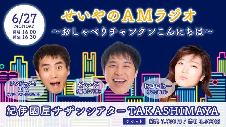 せいやのAMラジオ~おしゃべりチャンクンこんにちは~ 22/6/27(月) 紀伊國屋サザンシアター TAKASHIMAYA シェア ツイート 上演情報 ジャンル お笑い 料金 前売-3,000円当日-3,500円 5歳以上有料、4歳以下膝上無料。ただし、席が必要な場合は有料車いす席を利用する際は、チケット購入前に FANYチケットまで要問合せ キャスト&スタッフ 出演 霜降り明星・せいや ランジャタイ・国崎 ヒコロヒー [出演]霜降り明星・せいや / ランジャタイ・国崎 / ヒコロヒー お問い合わせ FANYチケット 10:00~19:00 公式サイト シェア ツイート