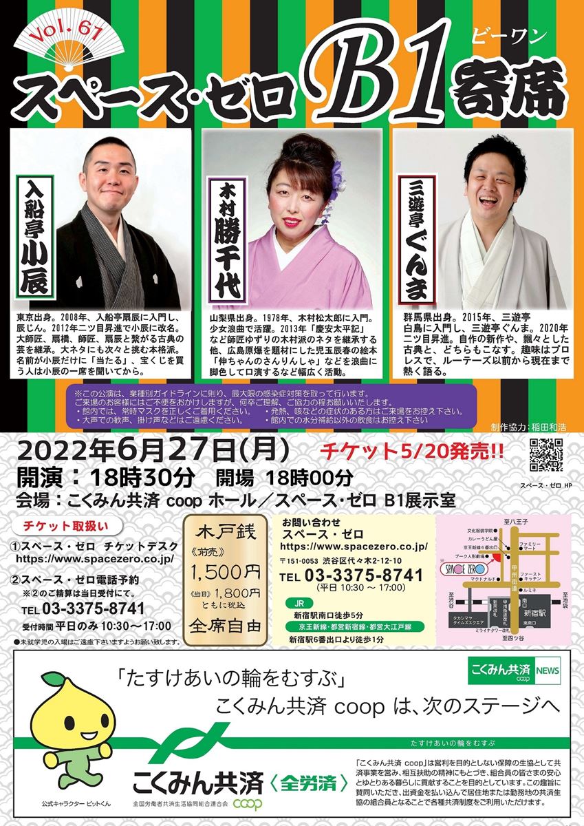 『スペース・ゼロB1寄席 Vol.61』 22/6/27(月) こくみん共済 coop ホール(全労済ホール)/スペース・ゼロ シェア ツイート 上演情報 ジャンル 落語/演芸 料金 前売-1,500円当日-1,800円 全席自由未就学児童は入場不可 キャスト&スタッフ 出演 入船亭小辰 木村勝千代 三遊亭ぐんま [出演]入船亭小辰 / 木村勝千代 / 三遊亭ぐんま お問い合わせ スペース・ゼロ 10:30~17:00・土日祝休 公式サイト シェア ツイート