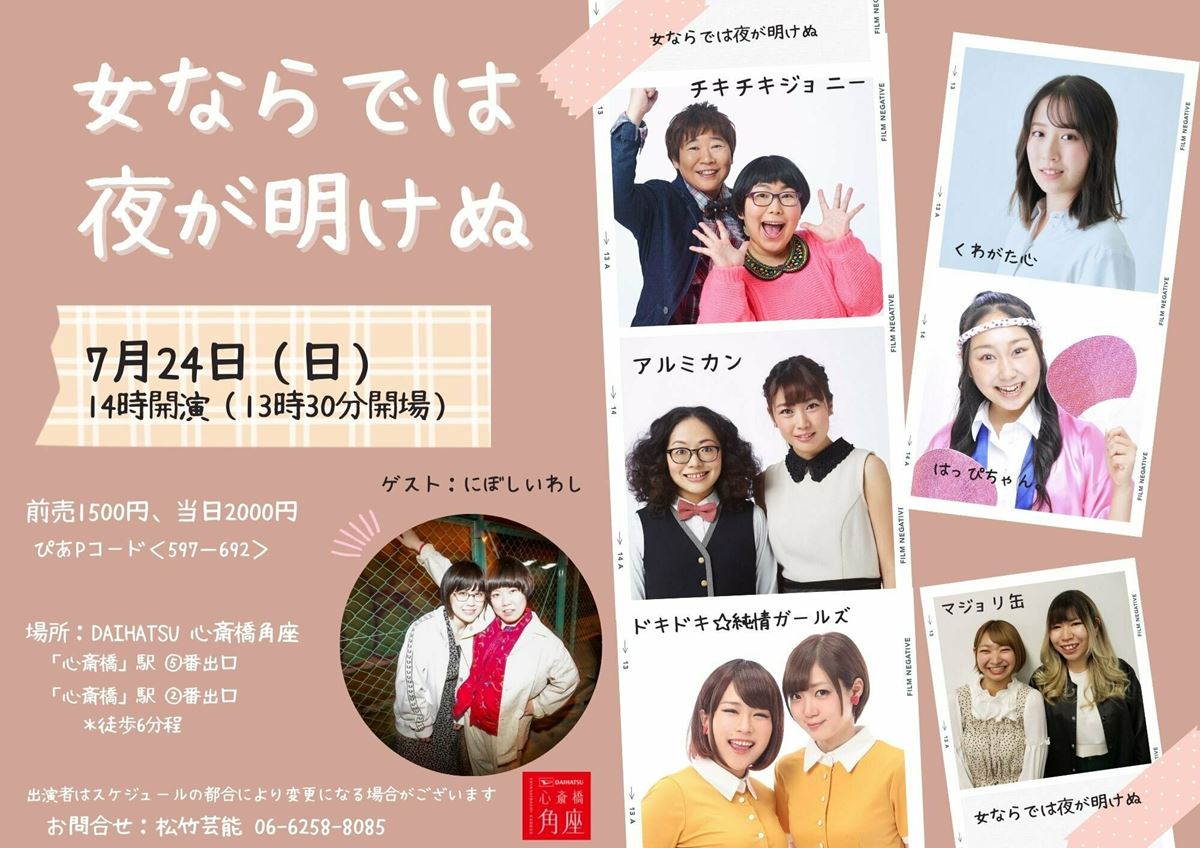 女ならでは夜が明けぬ 22/7/24(日) DAIHATSU 心斎橋角座 シェア ツイート 上演情報 ジャンル お笑い 未就学児童は入場不可。出演者は変更になる場合があります。 料金 前売-1,500円当日-2,000円 全席自由・整理番号付 表示できるチケット情報はありません詳しくはこちら キャスト&スタッフ 出演 チキチキジョニー アルミカン ドキドキ☆純情ガールズ はっぴちゃん。 くわがた心 マジョリ缶 ゲスト にぼしいわし [出演]チキチキジョニー / アルミカン / ドキドキ☆純情ガールズ / はっぴちゃん。 / くわがた心 / マジョリ缶 [ゲスト]にぼしいわし お問い合わせ 松竹芸能 公式サイト シェア ツイート